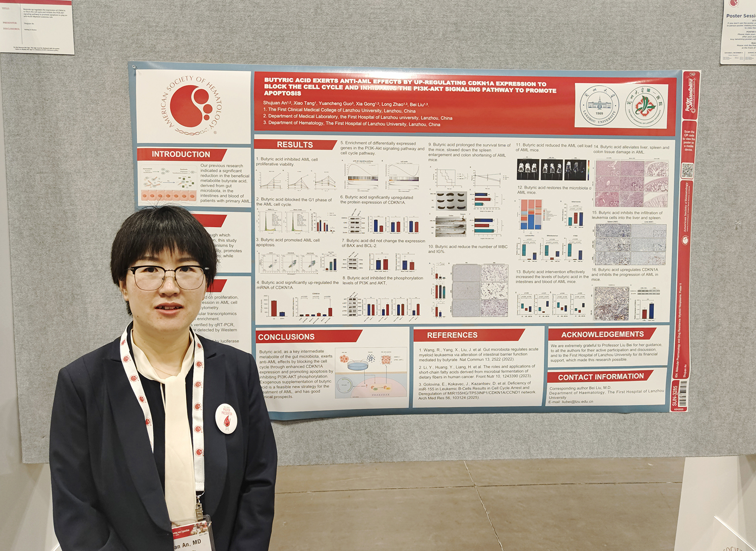 第一作者为副主任检验技师安淑娟,通讯作者为刘蓓教授的另一项研究,Butyrate up-regulates the expression of CDKN1A to block the cell cycle and inhibits the PI3K-AKT signaling pathway to promote apoptosis to play an anti-Acute Myeloid Leukemia role(丁酸通过上调CDKN1A阻断细胞周期和抑制PI3K-AKT通路促进凋亡发挥抗AML作用)以壁报形式进行交流,该研究探讨了丁酸抑制了AML细胞的增殖活力,促进了细胞凋亡,并使AML 细胞阻滞在G1期,为AML的研究与治疗探索提供了新的思路。