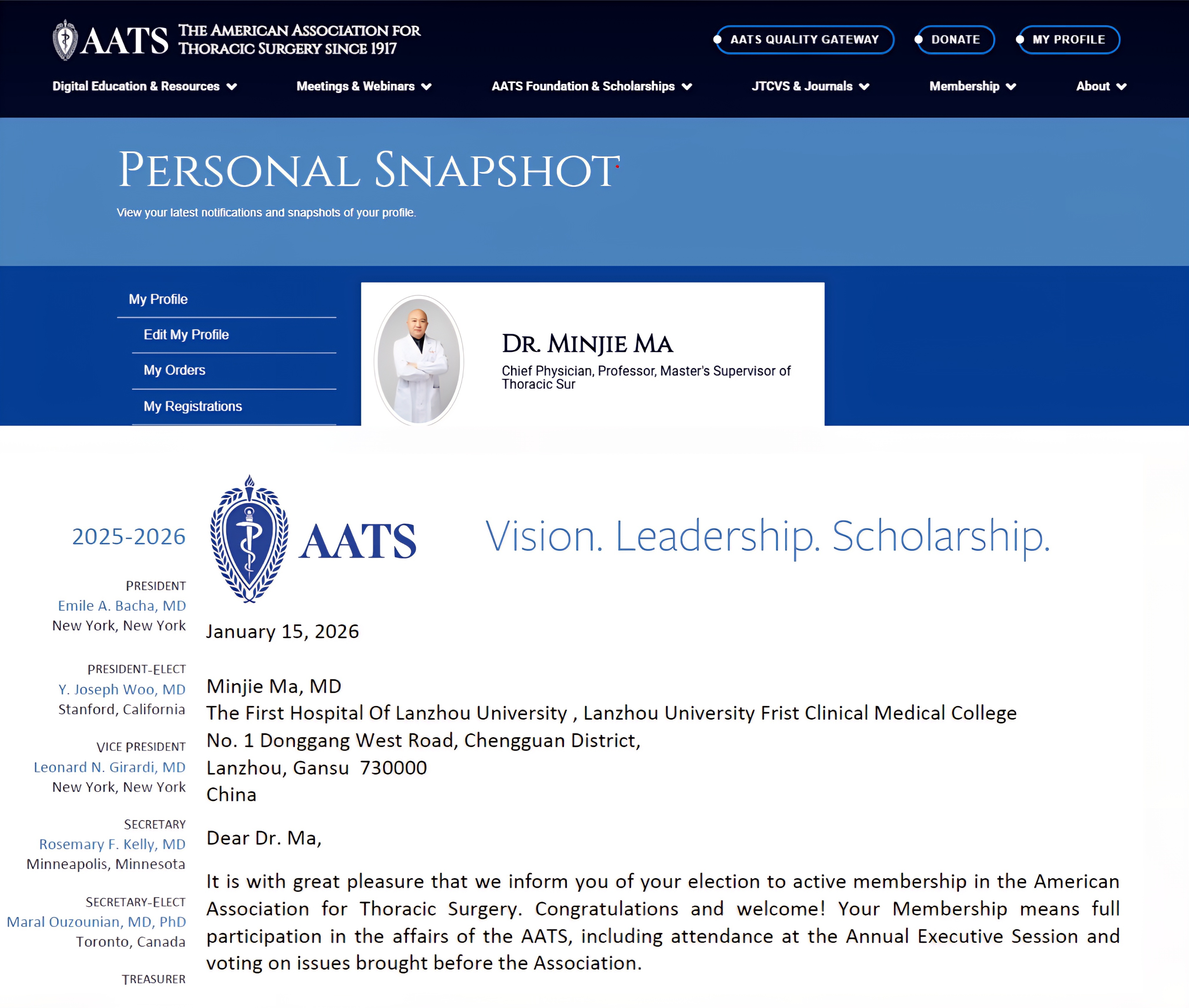 美国胸外科学会(AATS)成立于1917年,实行严格的提名和担保制度,候选人需在临床实践、学术研究、教育推广及领导力方面持续作出贡献,并由多位现任资深会员推荐,经过会员委员会的全面评审方能当选。目前,AATS在全球范围内拥有约1,500名会员,其中中国籍胸外科会员均为国内顶尖医疗机构的领军人物。