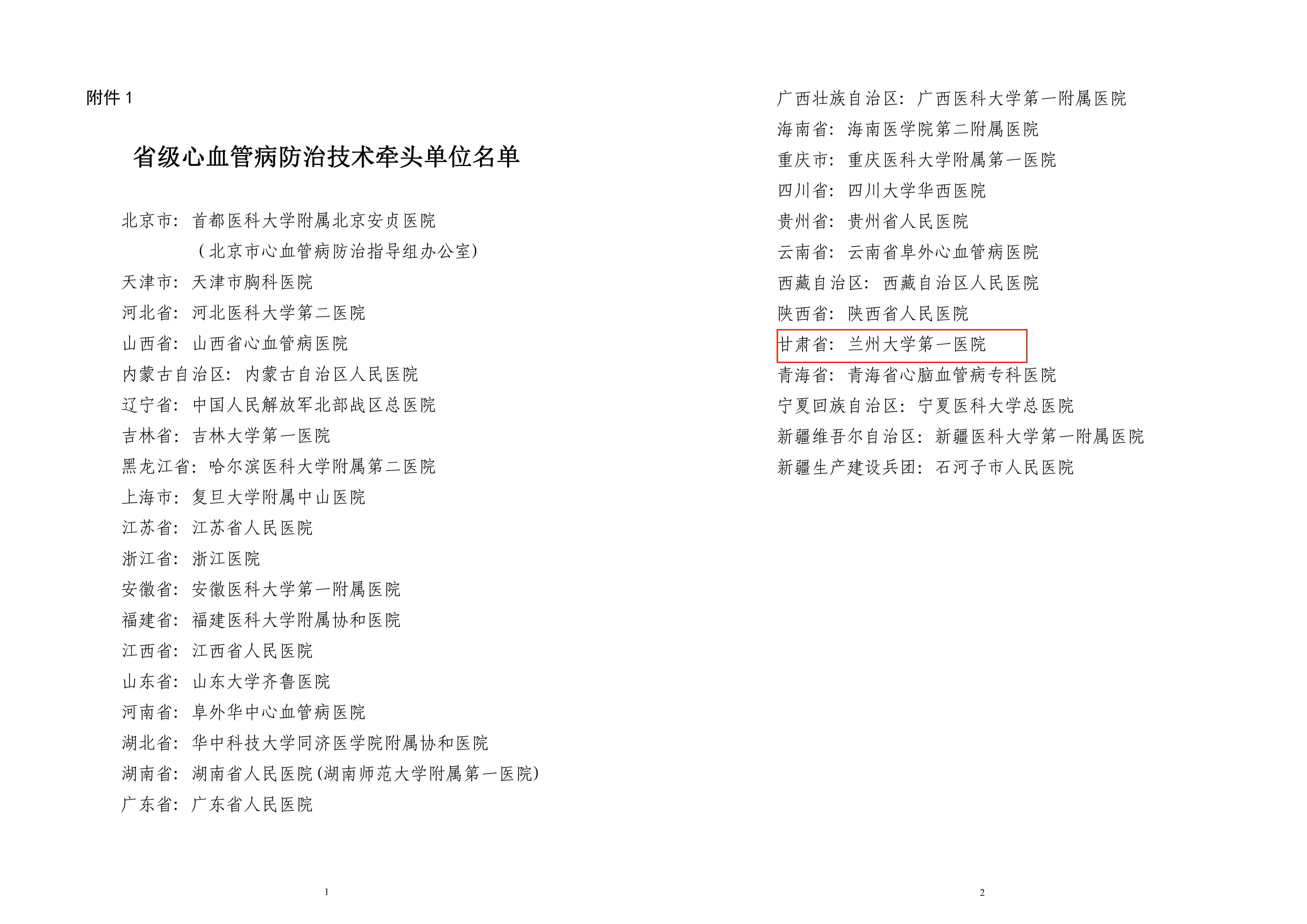 近日,国家卫生健康委印发《关于确定省级心血管病和脑血管病防治技术牵头单位的通知》,公布了省级心脑血管疾病防治技术牵头单位名单。兰州大学第一医院入选省级心血管病防治技术牵头单位。
