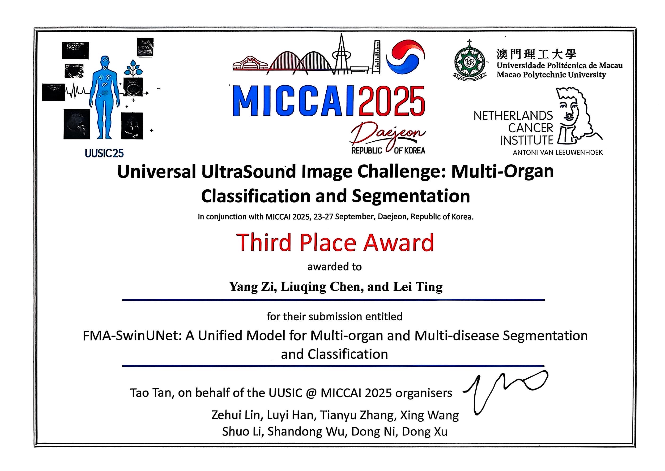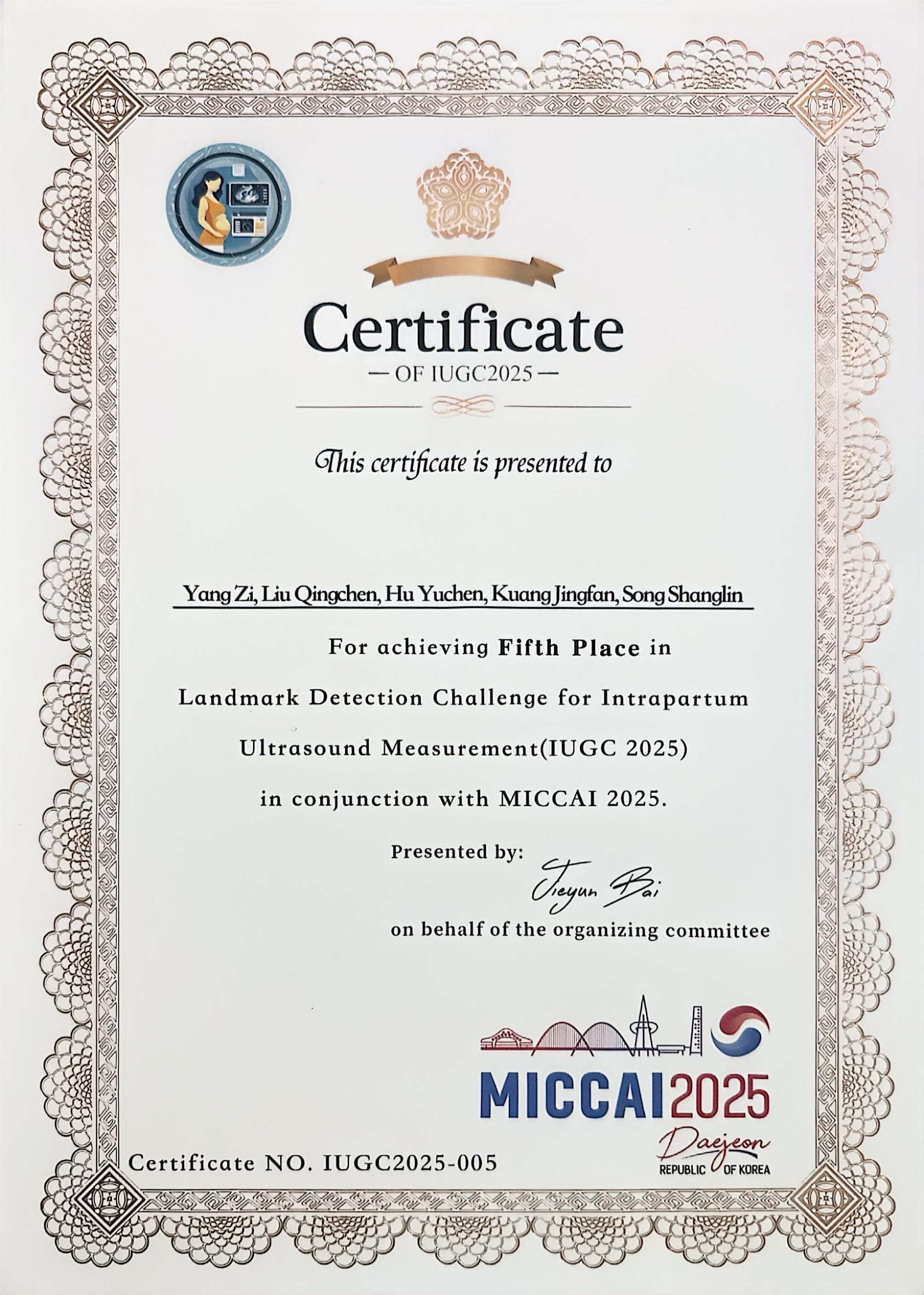 9月23日至27日,第28届国际医学影像计算与计算机辅助介入大会(MICCAI 2025)在韩国大田召开。兰大一院信息中心人工智能组组长杨子等表现突出,分别斩获“通用超声多器官多任务挑战赛(UUSIC)”第三名,“分娩期超声坐标回归任务(IUGC)”第五名的优异成绩。