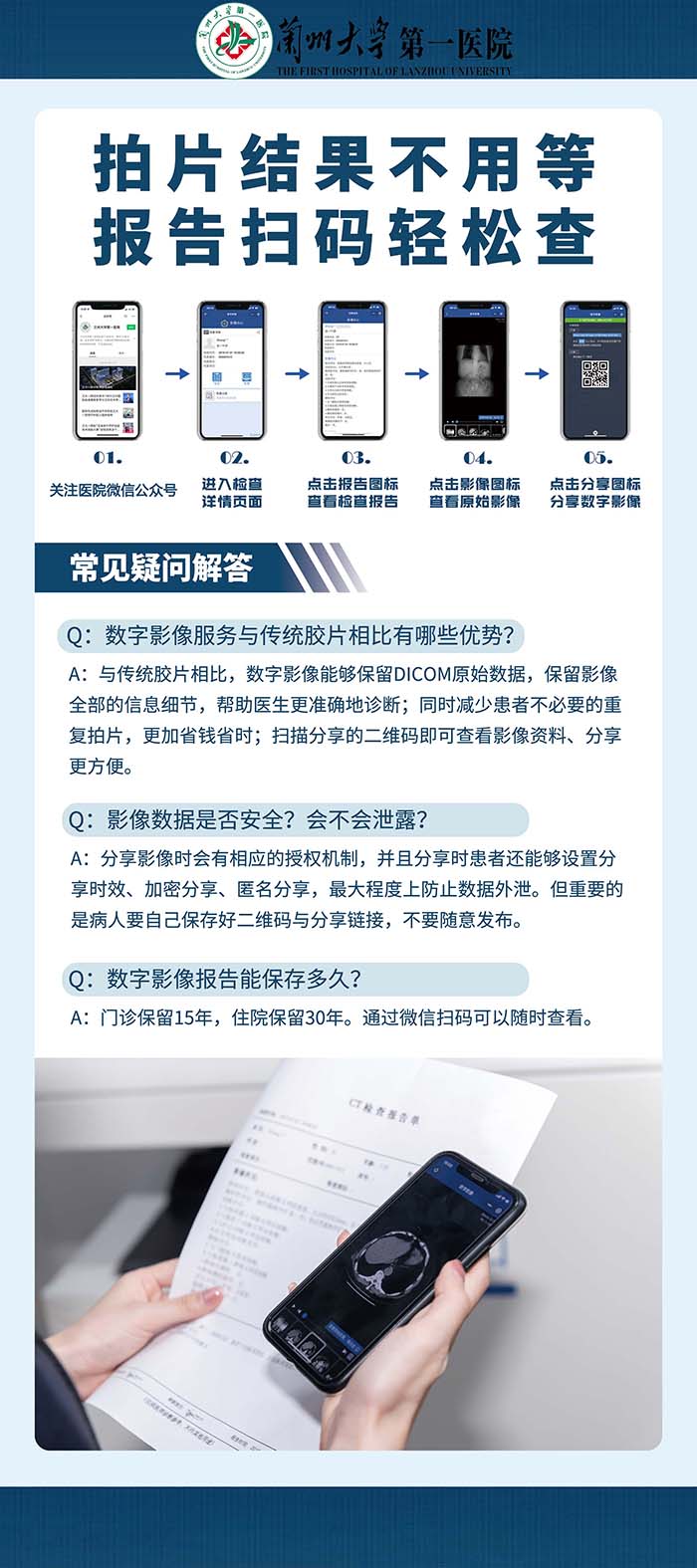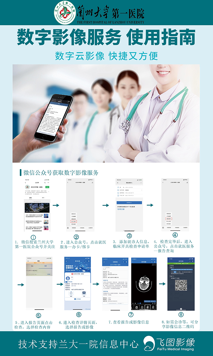 患者朋友们可以通过手机微信关注“兰州大学第一医院”公众号,进入公众号后,点击就医服务,选择办卡/绑卡,添加就诊人信息后,再次点击就医服务-报告查询,影像资料就会即时出现在手机屏幕上,操作简便,可以随时随地方便地查看、下载历次检查报告和影像资料。此外,患者还可以通过授权的方式分享影像资料给就诊医院的医生或者外院的诊断医生,获得诊断建议。