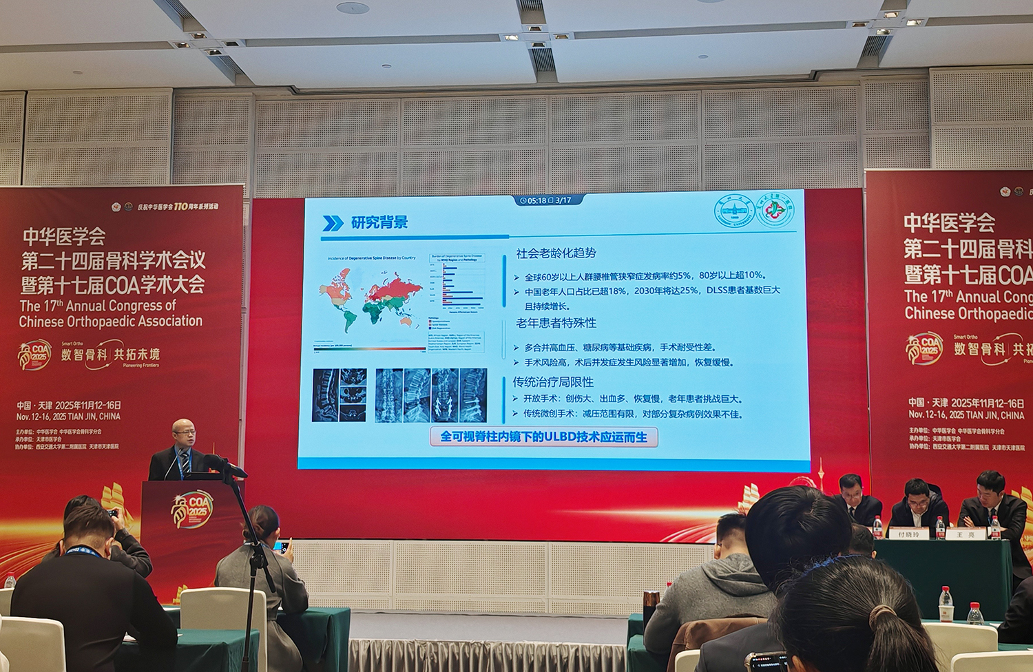 大会期间,骨科一病区王昕主任以“ERAS联合全可视脊柱内镜ULBD术治疗老年退行性腰椎管狭窄”为题作专题发言,通过临床案例解析与多组数据对比,系统阐释了该技术在缩短患者住院周期、提升术后功能恢复效率方面的显著优势,“微创技术+快速康复”一体化诊疗模式引发与会专家的关注与探讨。