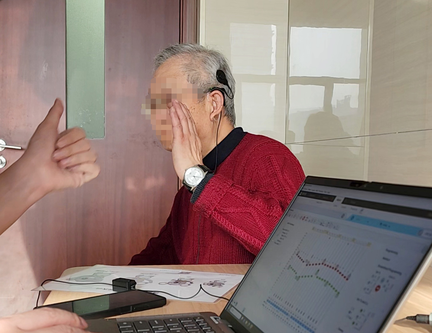程爷爷患有“老年性聋”,是一种因年龄增长导致听觉系统退行性变而引起的常见疾病,主要表现为双耳进行性、对称性的听力下降,尤其在高频听力方面更为明显,常伴有“听得见声音、听不清内容”的言语分辨困难。随后的调试过程中,工程师通过专业设备,向老人左耳的人工耳蜗发出不同频率、不同分贝的测试音,每当感知到声音,老人便立刻举手示意。令人欣喜的是,即使是较为轻柔、细微的声音,老人也能在第一时间准确反应,举手干脆利落,准确率高。这说明耳蜗内的电极工作良好,听神经对电刺激的反应理想。