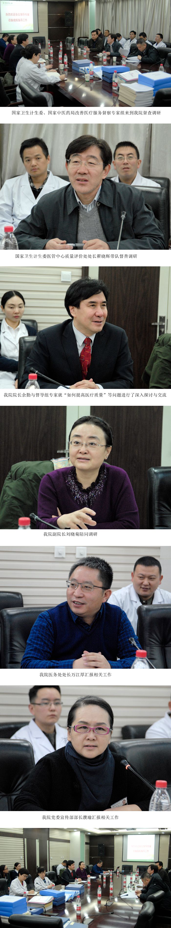 2017年2月21日,由国家卫生计生委医管中心质量评价处处长翟晓辉带队,国家卫生计生委、国家中医药局改善医疗服务督察专家组来到我院督查调研。我院院长余勤、副院长刘晓菊陪同调研。