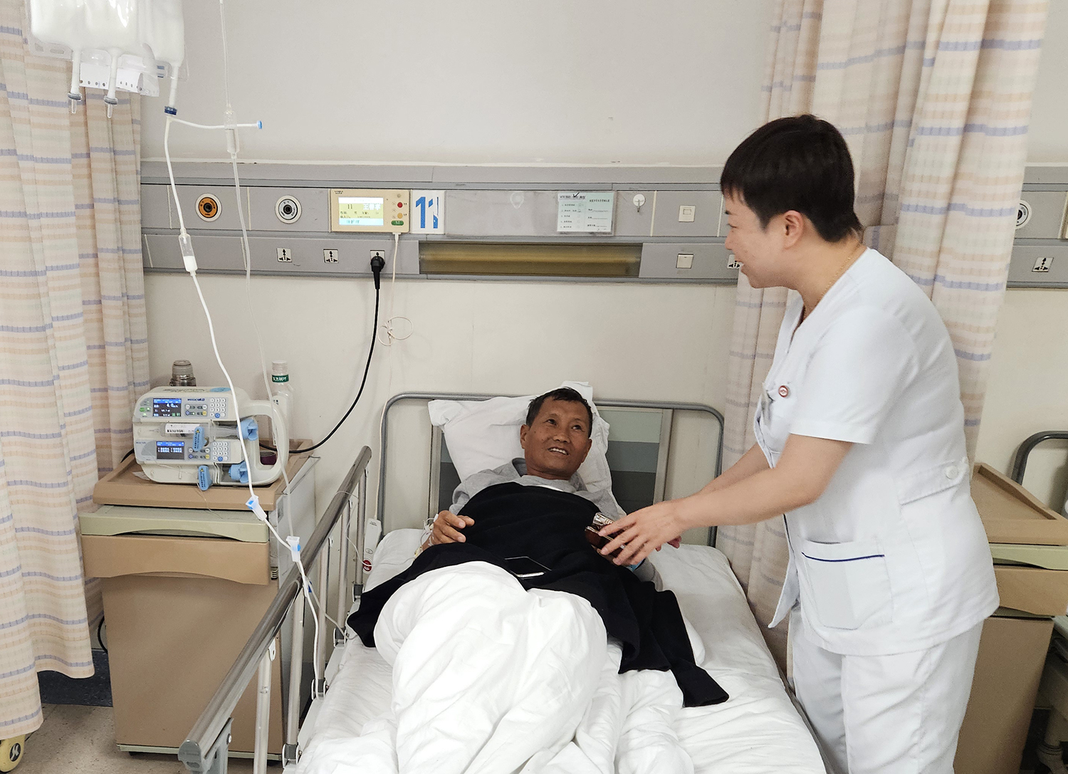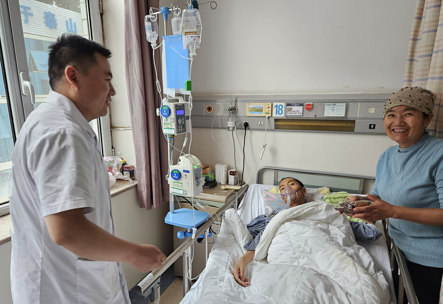 “太意外了,谢谢你们!”“中秋快乐,你们也辛苦了!”“没想到,你们那么辛苦,还为我们精心准备礼物,真的太感谢了。”一声声感谢和祝福,让病房充满了节日的温馨。医护人员们也鼓励患者要积极配合治疗,争取早日康复。