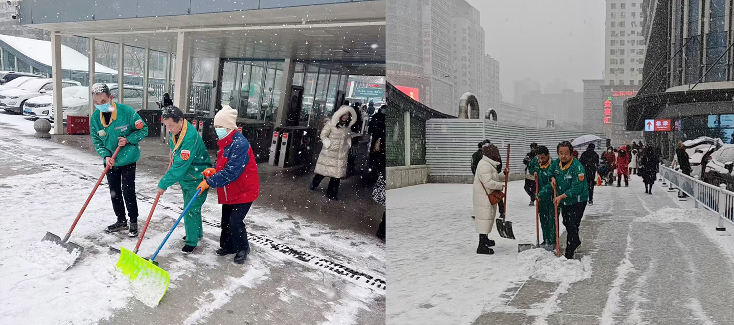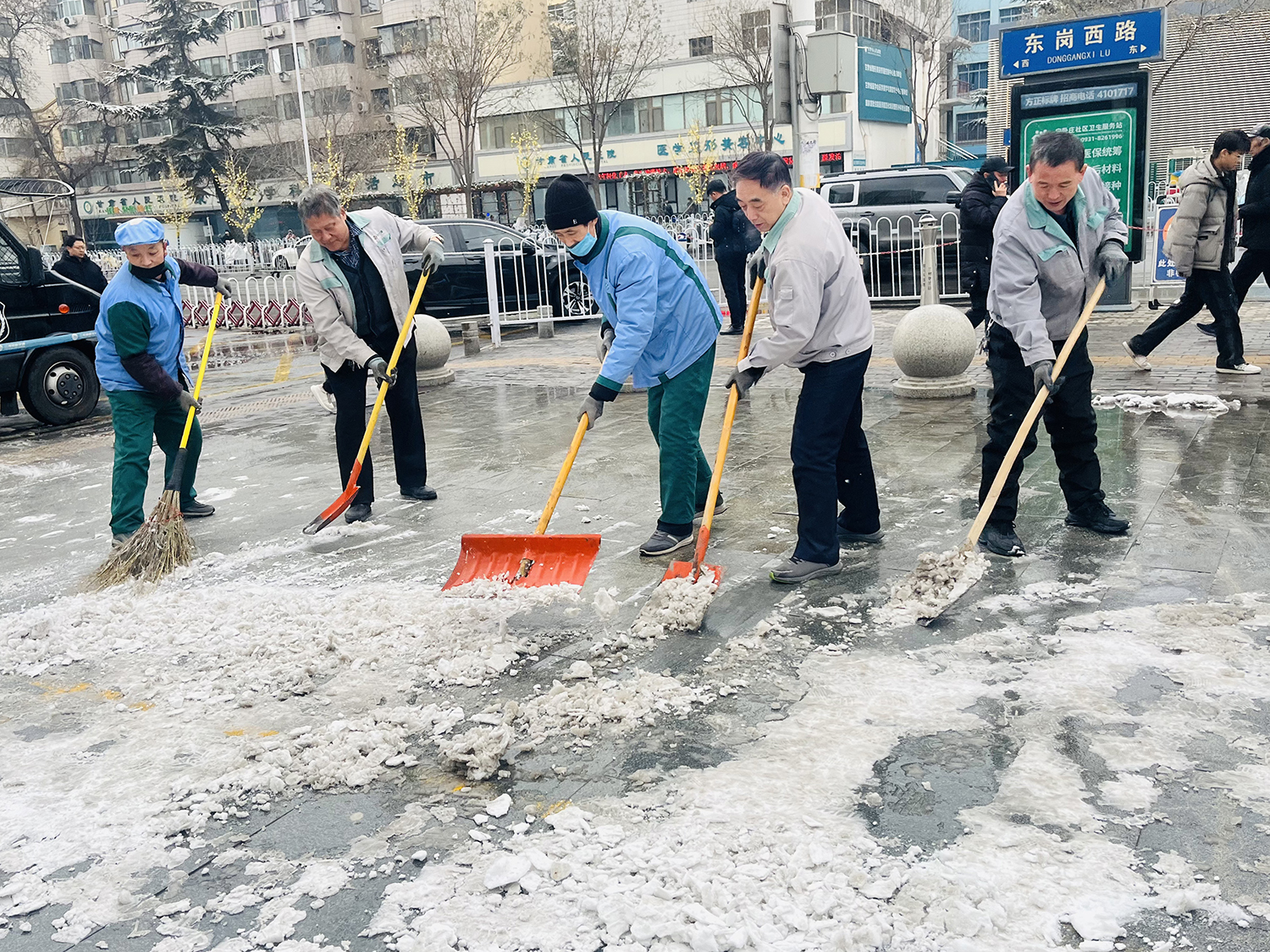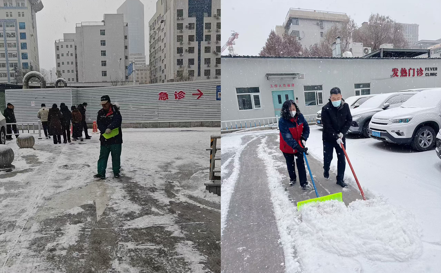 经过数小时作业,门诊及住院部周边核心通行区域的积雪结冰全部清除,全力保障了早高峰就诊患者及医护人员的出行安全。