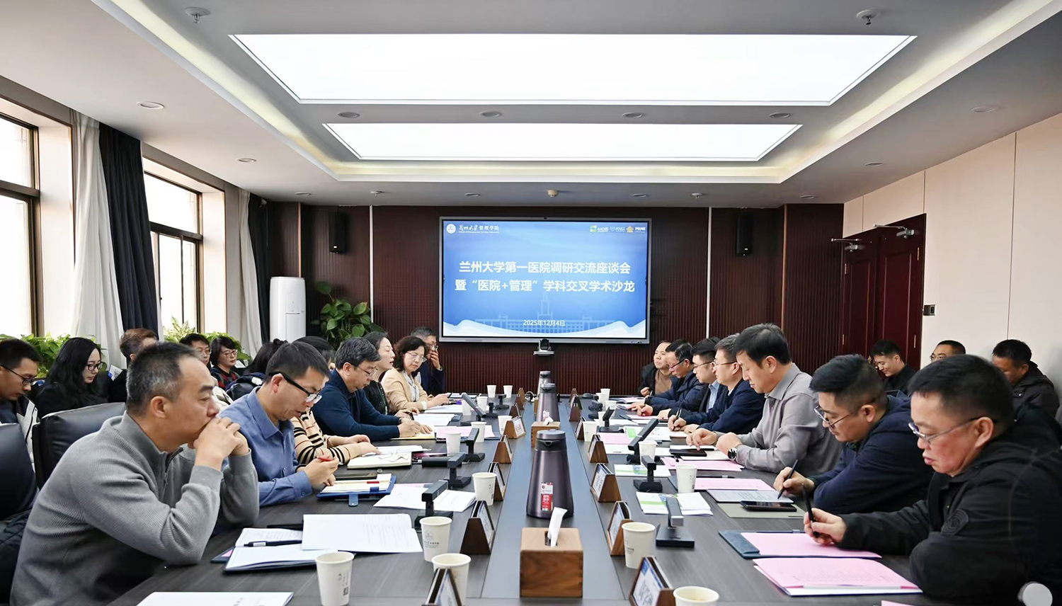 12月4日上午,兰州大学第一医院(第一临床医学院)与兰州大学管理学院联合举办“医学+管理”跨学科学术交流会。副院长侯小明带领医院科技处、人事与师资处、医务处、护理部、门诊部、财务与资产管理处、运营管理处、信息中心、设备处、教务处、研究生处、对外合作交流处、急诊科、体检中心、药剂科等15个职能部门及科室主要负责人赴管理学院开展学术交流活动。管理学院党委书记刘亚军主持会议,院长王康周,党委副书记、副院长常韬,副院长保海旭及学院教授代表出席。