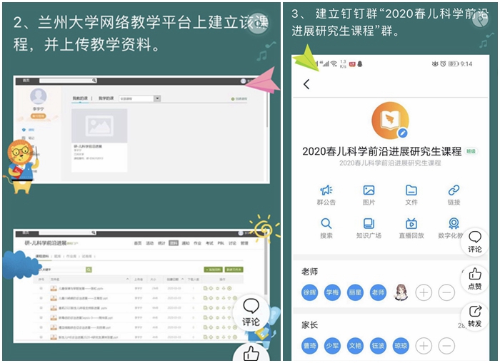 目前,线上教学工作的开展逐步趋于稳定。学生将在各自所选课程建立的微信群内收到课程安排,根据通知登陆兰大网络教学平台,对教师预先上传的课件及学习资料进行自学和预习。任课教师会结合腾讯会议、钉钉等网络直播平台进行在线教学,在线教学主要以探讨或小组会议等方式进行。同时,任课老师或带教秘书还会在微信群内统一为学生进行答疑解惑和课业辅导。第一临床医学院研究生线上教学形成了课前学习、课堂深入交流探讨、课后针对答疑,最终达到深化理解、强化教学的目的。