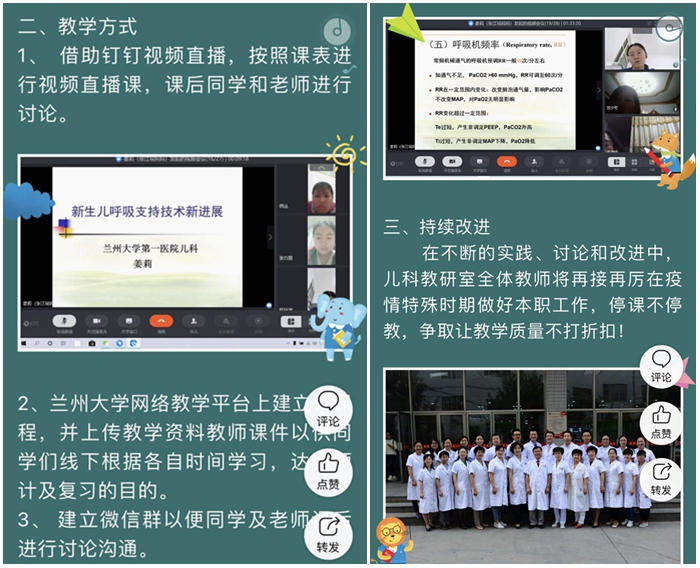 领导重视、专家督导:在线教学开展以来,学院领导高度重视,明确任务要求,确保事事落实。学校研究生院领导和督导专家随机听取第一临床医学院部分采用直播方式讲授的课程,了解在线授课的实际情况。学校对第一临床医学院开设的学科通开课《儿科学前沿进展》进行督导与表扬。评价为“由主讲教师和在线辅助教师组成教学团队,主讲教师负责课程讲授和互动交流,辅助教师负责课前考勤,课中教学秩序维持,同时也参与互动交流,课程教学效果良好。”