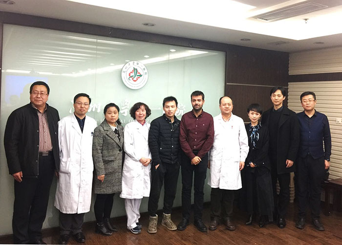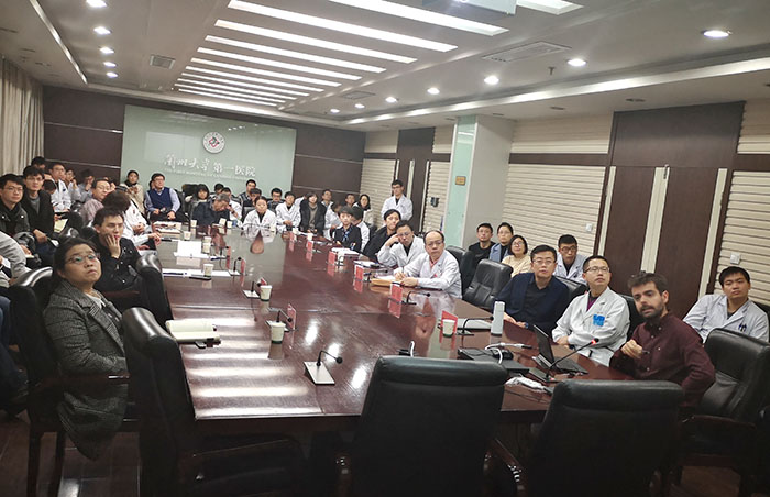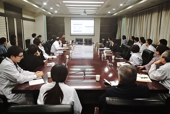 2018年12月6日,应李汛院长邀请,西班牙巴萨罗那大学生物医学研究所肝脏血管研究小组负责人Jordi Gracia-Sancho教授和中国门脉高压无创诊断研究组CHESS负责人,哈佛大学医学院祁小龙博士来我院进行学术交流。我院院长李汛,及科技处、普外二科、普外五科、传染科、介入科、放射科、药剂科等科室负责人和相关研究团队参加了此次学术交流活动。