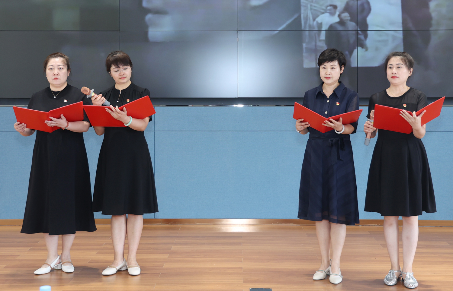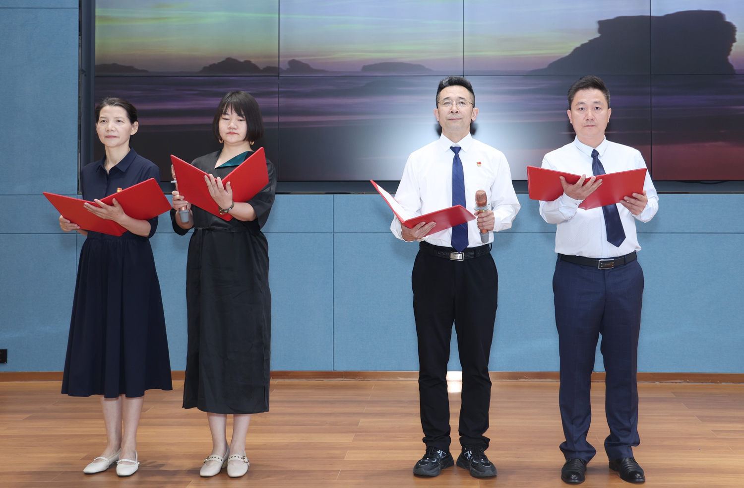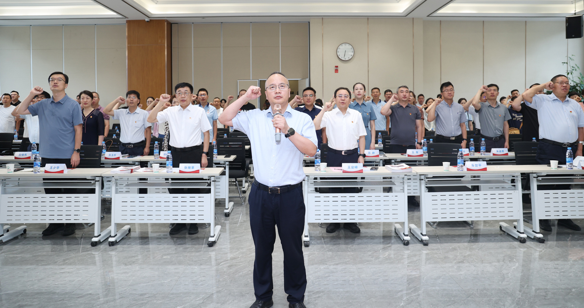 首先全体起立,奏唱中华人民共和国国歌,由魏玉辉领誓,重温入党誓词。