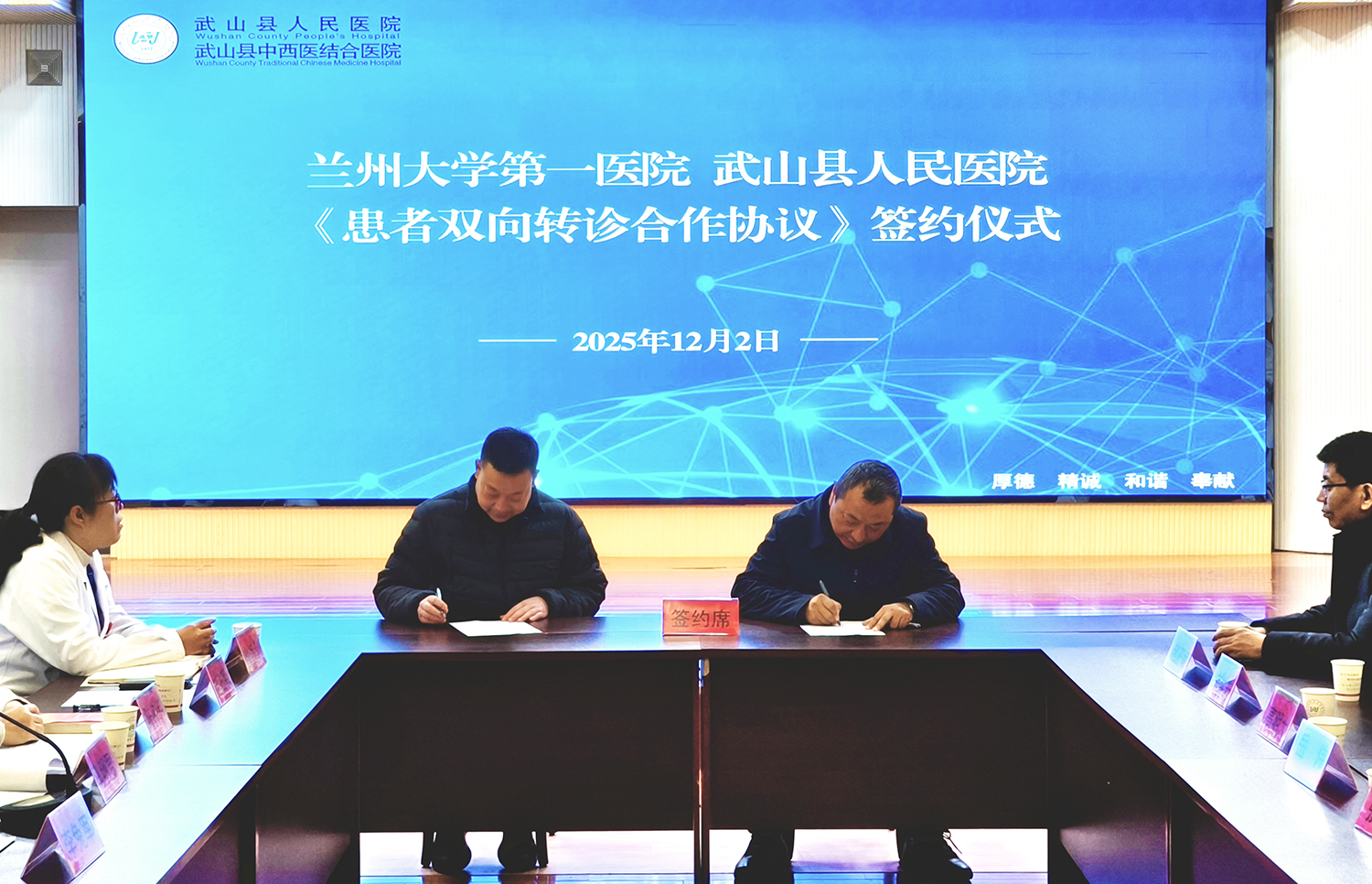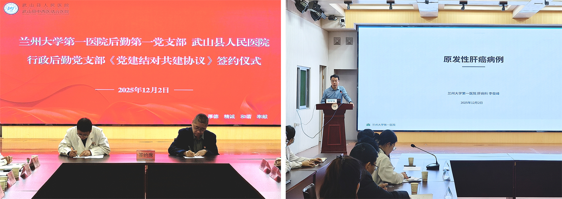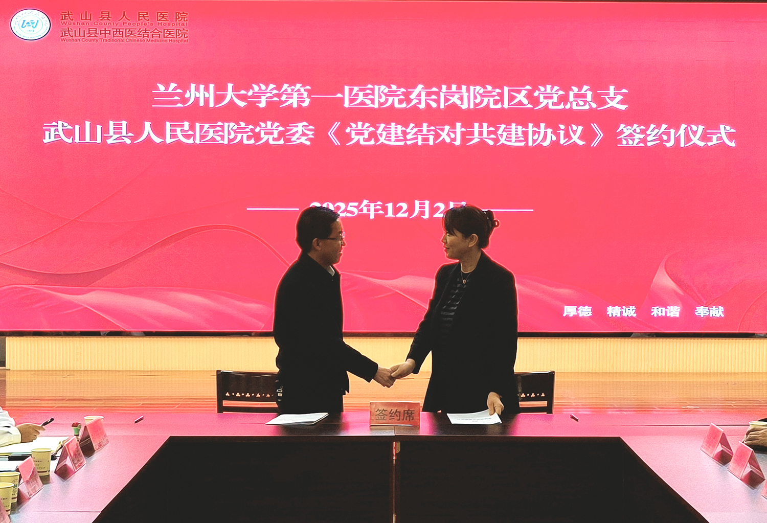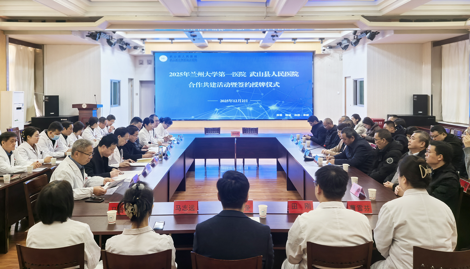 12月2日,兰大一院与武山县人民医院举办合作共建活动,通过签署系列合作协议、开展专家帮扶与学术培训,聚焦党建共建、医疗协作、专科发展,进一步推动优质医疗资源下沉,助力武山县医疗卫生服务能力提升。兰大一院党委委员、副院长兼东岗院区院长张立婷,党委委员、副院长雷军强,武山县人民医院党委书记李兔军出席,活动由武山县人民医院党委副书记、院长马明君主持。