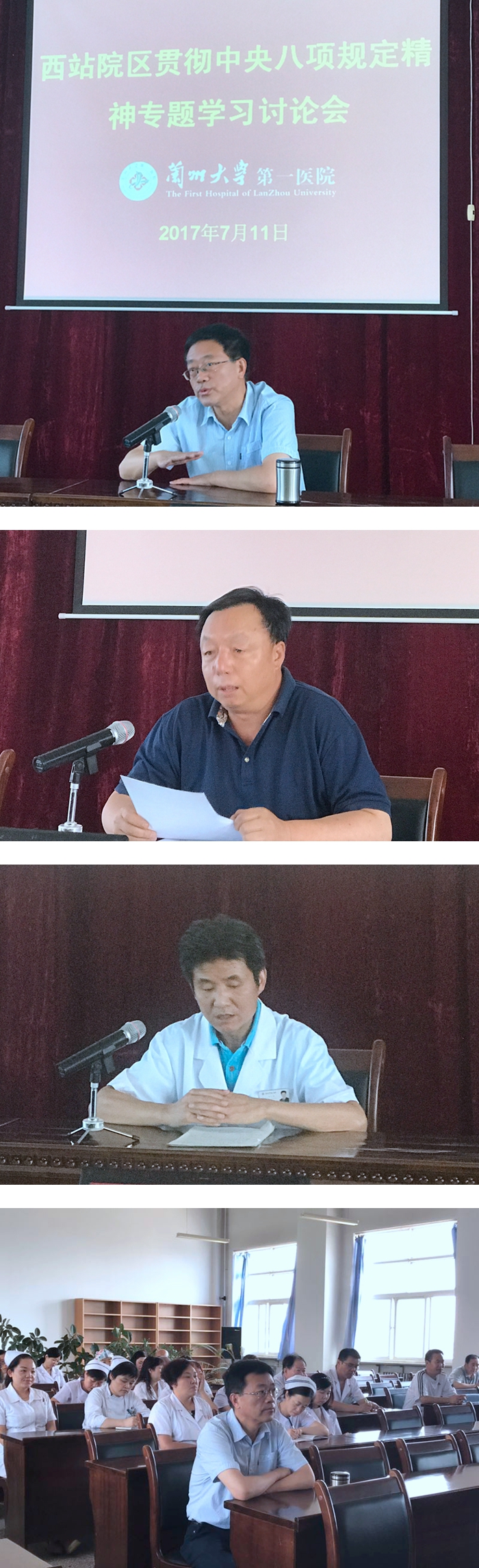 2017年7月11日上午,兰州大学第一医院西站院区直属党支部在第一会议室召开“贯彻中央八项规定精神”专题学习讨论会。副院长周永宁、西站院区常务副院长沈正高参加会议。西站院区直属党支部书记刘振明主持会议。
