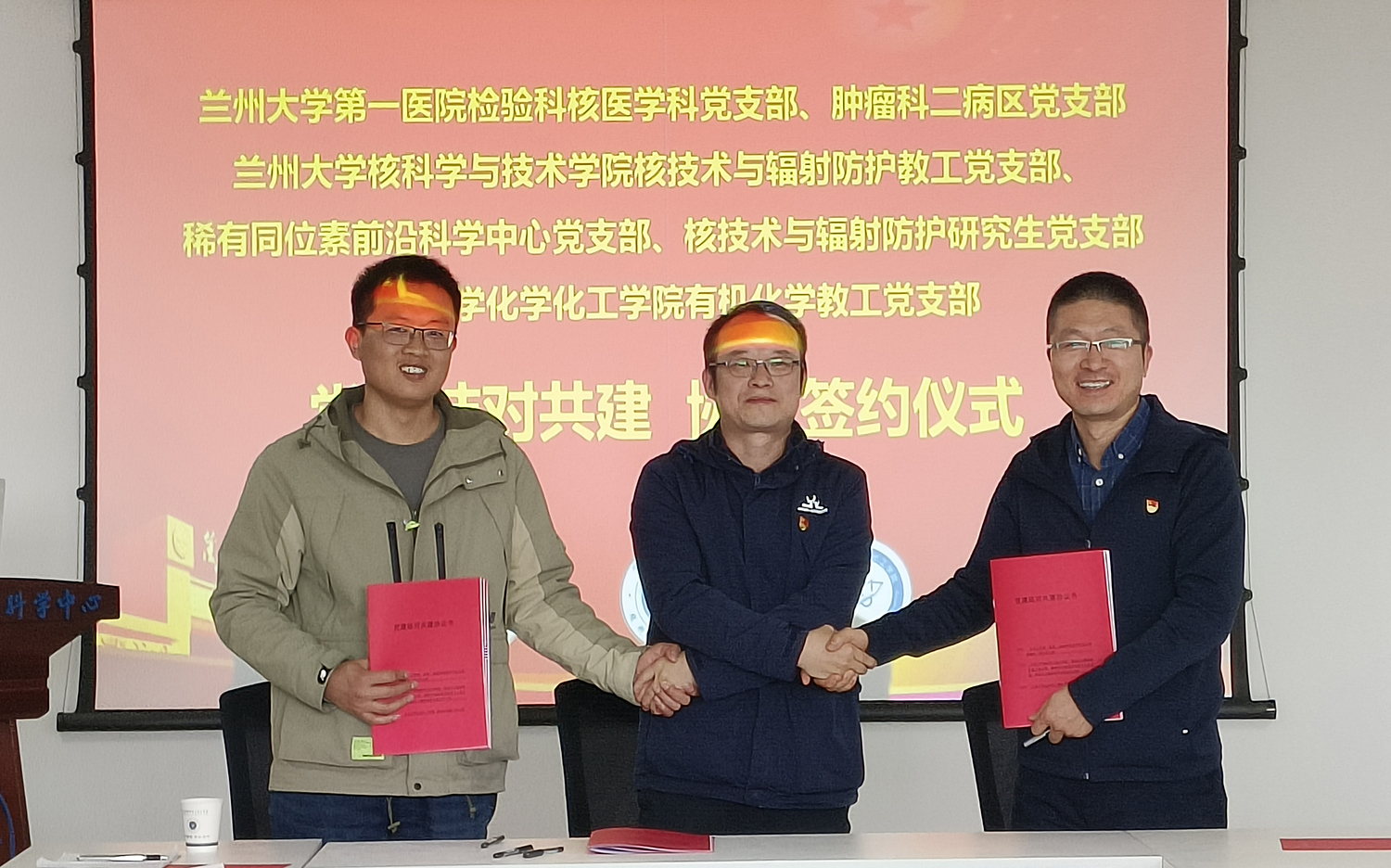 兰大一院党委委员、副院长侯小明,肿瘤科二病区党支部书记冉俊涛,检验科核医学科党支部书记陈明及党员代表参加共建活动,与兰州大学核科学与技术学院党委书记付鹏、兰州大学化学化工学院教工党支部组织委员赵宪鹤、核学院师生共建党支部副书记崔莹、核学院研究生党支部书记张世旭等,就党建结对共建及粒子治疗领域发展合作进行讨论与交流。
