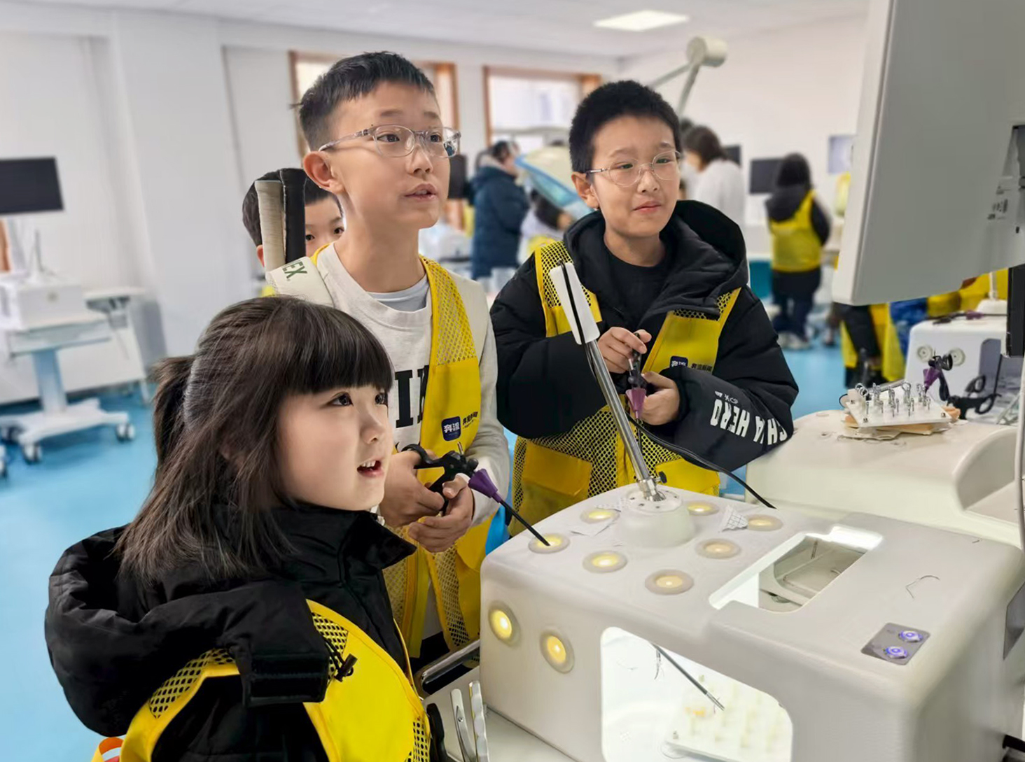 在中心教师的全程引导下,小记者们依次参观了医学AI智能实验室与微创手术模拟培训中心,亲手操作了模拟腹腔镜设备,认真学习和练习了规范的“七步洗手法”以及成人与婴幼儿心肺复苏的关键操作要领。同时,教师借助人体模型,生动讲解胚胎发育过程,并通过互动问答帮助孩子们理解医学知识。活动最后,小记者们围绕所见所学对教师进行了现场采访。
