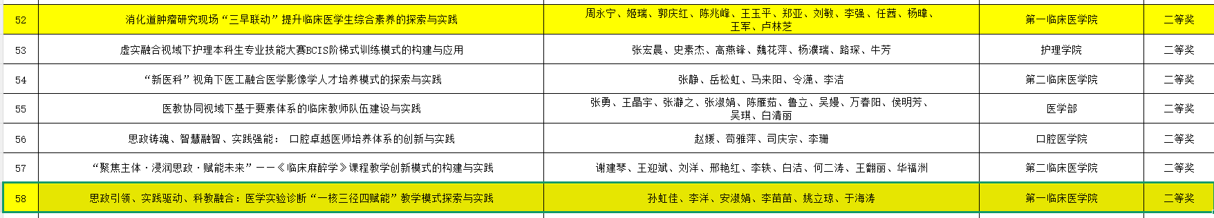 近日,兰州大学公布2025年度本科教学成果奖评审结果。第一临床医学院周永宁教授团队申报的“消化道肿瘤研究现场‘三早联动’提升临床医学生综合素养的探索与实践”,孙虹佳教师团队申报的“思政引领、实践驱动、科教融合:医学实验诊断‘一核三径四赋能’教学模式探索与实践”均荣获校级二等奖,展现了学院在教育教学改革方面的持续努力与成效。