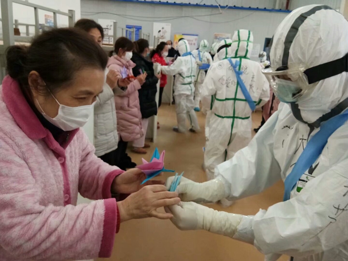 “飞鹤传递着最美的祝福,衷心祝愿大家早日康复,我们一起去看浪漫的樱花……”活动一开始,医疗队员们就站成一队,一边向前走,一边向两边的患者赠送队员们亲手折好的千纸鹤,色彩斑斓的一只只千纸鹤上,还粘贴着各种美味的糖果。