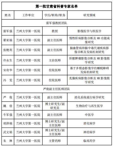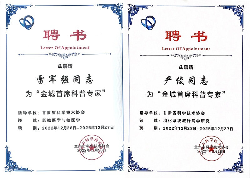 本次仪式上,共有150名甘肃省科普专家、57名金城首席科普专家接受聘任。兰大一院的雷军强教授团队、严俊副主任医师团队入选第一批甘肃省科普专家和第二批金城首席科普专家,并被授予“科学传播专家工作室”铭牌。