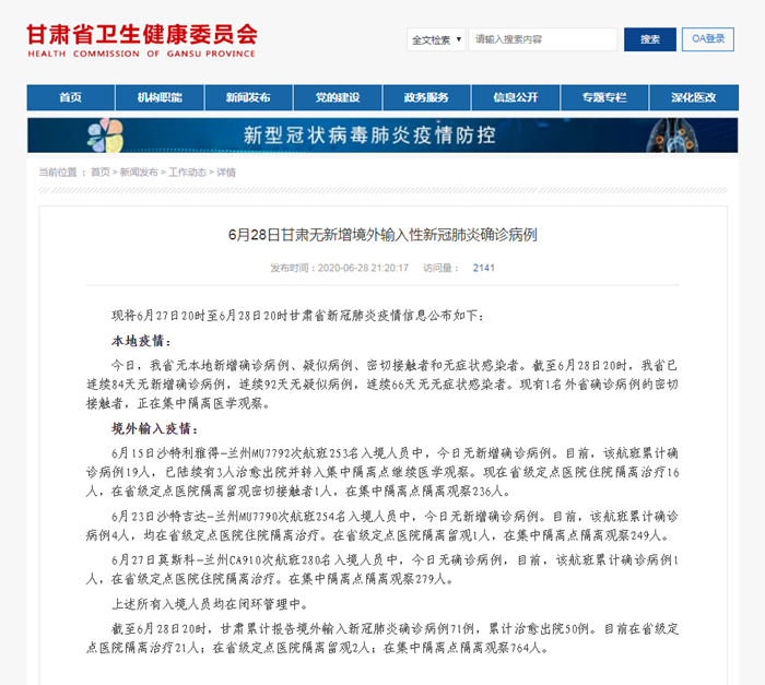 6月28日甘肃无新增境外输入性新冠肺炎确诊病例
