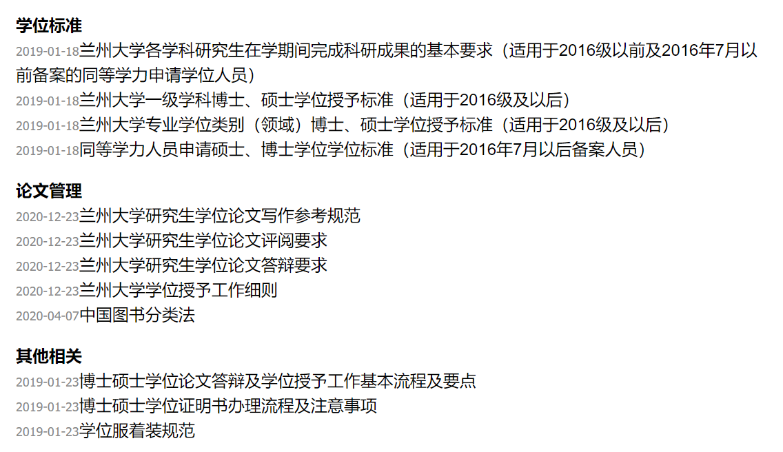 兰州大学研究生学位标准、论文管理以及其他相关规章制度链接: