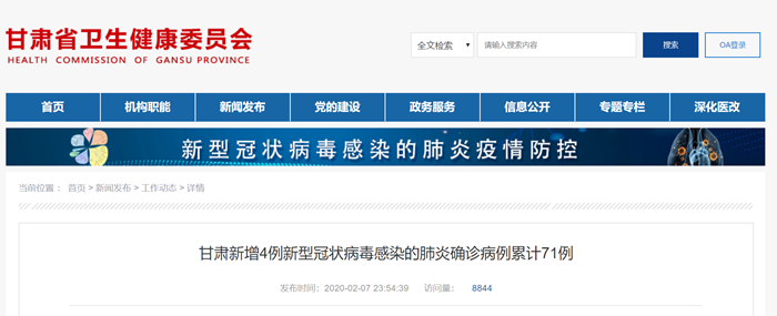 甘肃新增4例新型冠状病毒感染的肺炎确诊病例累计71例